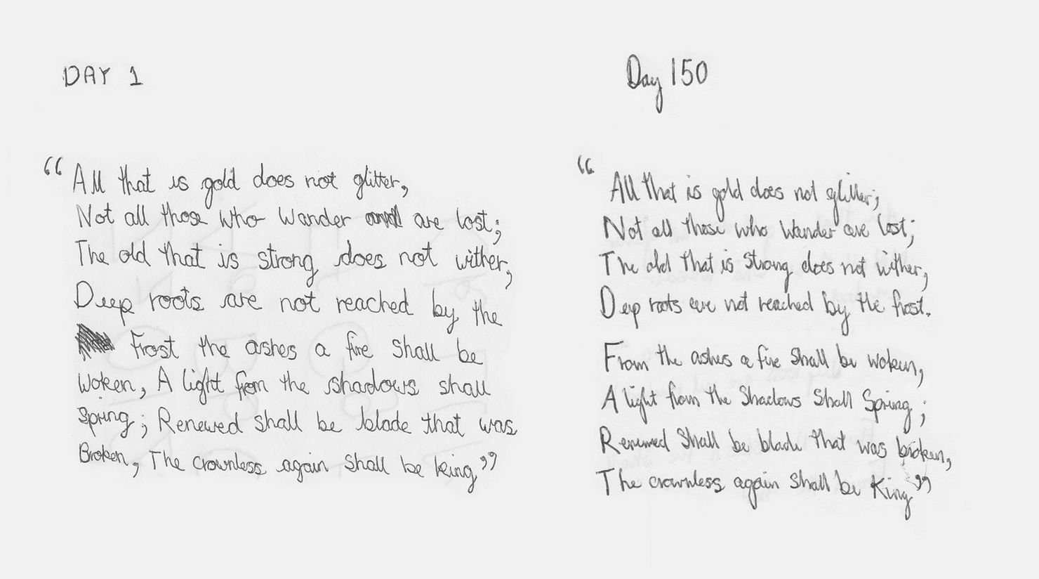 I replay this conversation a lot in my head. It always makes me smile. It always reminds me of who I am and challenges me to be brave and do something new [no matter how big or small]. In December of 2020 I began teaching myself how to write left handed. I wanted to further encourage my brain to work a little differently. I thought it might make me a bit more creative, you know, left brain and all that...and I wanted to see if I could stick at it. Everyday I spent about ten minutes writing with my left hand. Man was it hard to begin with. Just holding the pen felt so alien and wrong - not dislike the first time I held a guitar. I carried on for 150 days and the results were really fun to compare. Along with the alphabet, my name and some occasional random words, I would always recite and write both the Viking Prayer [a bad ass beautiful prayer] and the poem Bilbo writes about Aragorn in Tolkien's 'The Lord of The Rings'. Below you can see the visible improvement from day 1 and day 150. It's amazing to see the evolution of my left had writing as it now looks almost like my right hand writing.