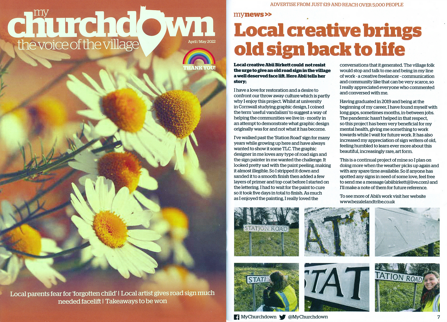 "I have a love for restoration and a desire to confront our throw away culture which is partly why I enjoy this project. Whilst at university in Cornwall studying graphic design, I coined the term ‘useful vandalism’ to suggest a way of helping the communities we live in - mostly in an attempt to demonstrate what graphic design originally was for and not what it has become. I’ve walked past the ‘Station Road’ sign for many years while growing up here and have always wanted to show it some TLC. The graphic designer in me loves any type of road sign and the sign painter in me wanted the challenge. It looked pretty sad with the paint peeling, making it almost illegible. So I stripped it down and sanded it to a smooth finish then added a few layers of primer and top coat before I started on the lettering. I had to wait for the paint to cure so it took five days in total to finish. As much as I enjoyed the painting, I really loved the conversations that it generated. The village folk would stop and talk to me and being in my line of work - a creative freelancer - communication and community like that can be very scarce, so I really appreciated everyone who commented and conversed with me. Having graduated in 2019 and being at the beginning of my career, I have found myself with long gaps, sometimes months, in-between jobs. The pandemic hasn’t helped in that respect, so this project has been very beneficial for my mental health, giving me something to work towards while I wait for future work. It has also increased my appreciation of sign writers of old, feeling humbled to learn ever more about this beautiful, increasingly rare, art form. This is a continual project of mine so I plan on doing more when the weather picks up again and with any spare time available. So if anyone has spotted any signs in need of some love, feel free to send me a message (abiibirkett@live.com) and I’ll make a note of them for future reference.